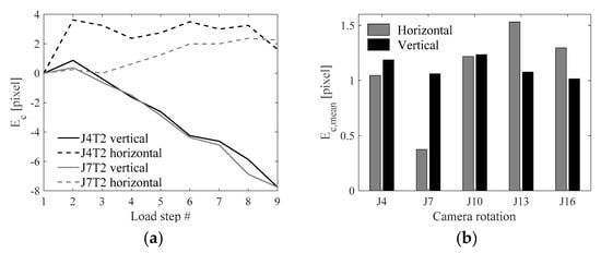 RCS rotation error () on the x-axis (horizontal) and y-axis (vertical) for two camera rotations J4 and J7 and target T2 (denoted as J4T2 and J7T2) near displacement sensor locations for each load step/image sequence are shown in Figure 8a. Vertical errors increase at each load step. Horizontal errors do not follow a similar trend to horizontal errors. Additionally, the magnitude of horizontal errors is slightly smaller than that of vertical errors. Mean RCS rotation error () is calculated using Equation (1):