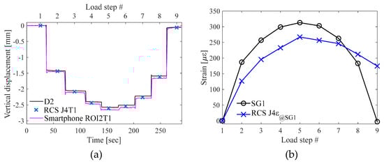 The structural response is obtained for all targets. However, only a few targets are used to compare measurement accuracy between contact sensors. Figure 9a shows a plot of vertical displacements measured with displacement sensor D2 and computed from target T1 at RCS rotation J4 and smartphone ROI2. The plot shows both time steps and load steps. The displacements during load application and removal are slightly different. This is due to the nature of the beam reaction to applied/remove loads. When the load is removed the beam does not return to its original shape. The vertical displacement is 0.05 mm. Although vertical displacements with both camera systems are in a good agreement with the displacement sensor data, the RCS offers higher measurement accuracies than the smartphone.