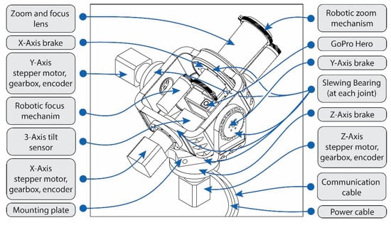 The proposed low-cost RCS, which combines a modified GoPro camera fitted with a long-range 1/2″ 25–135 mm F1.8 C-mount lens, a robotic mount, and software controls, is shown in Figure 2. The robotic mount uses a NEMA 17 stepper motor fitted to a 1:4 ratio gearbox providing enough torque and positional locking to rotate and hold the camera with the lens in the required position. The power is supplied via a USB cable connected to the mains or battery. The camera is positioned on the robotic mount via a lens holder arm keeping the camera sensor central to the rotational (vertical) axis. The main bracket of the robotic mount is designed to slide into a standard camera tripod where it is securely fixed.