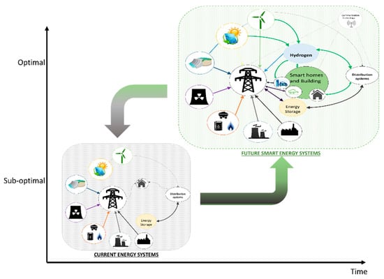 The Greenfield approach, used in other fields of study, advocates a strategy for designing future energy systems that eliminates constraints set by previous energy systems. Different forms of energy may be bridged together to establish synergism, as a fundamental step towards an optimum state. The linking of multiple energy carriers in centralized units was proposed in the early literature [1,4], i.e., energy hubs, where different forms of energy vectors may undergo transformation, conversion, and storage for later use. Devising and utilizing such bridging systems may lead to an optimal level of operation for energy systems. Figure 1 presents a schematic view for the transition to future energy systems.