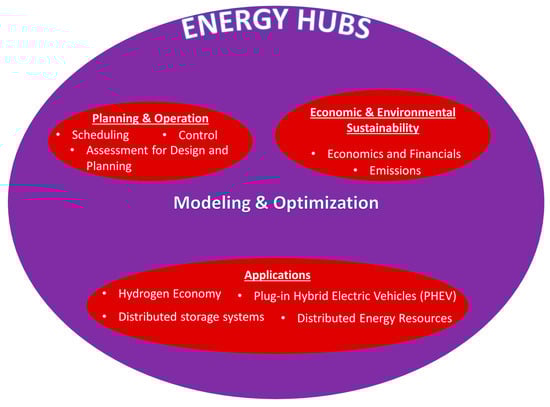 This review is comprised of three main parts: (i) introduction, (ii) modeling, and (iii) optimization. Along with the definition of an energy hub and an overview of its research initiation, the article classifies the literature to date. As evident from Figure 2, the research focuses on (a) planning and operation, (b) economic and environmental impacts, and (c) multiple applications of energy hubs. Each area is explored in detail.