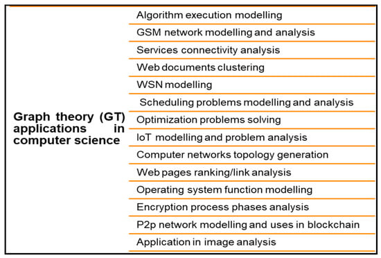 Graph theory techniques [] are widely used in different disciplines including chemistry, biology, physics, and computer science [,,]. GT is basically a mathematics concept with widespread applications in every discipline for modelling and analysis. In this paper, we briefly discuss the uses of GT in the field of CS and SNs [,,,,]. We present different applications of graph theory in both these domains. Recently, many efforts have been devoted to developing complex software/environments/packages that can render the complex graph containing excessive amounts of data in a single window or an interface [,,]. A comprehensive overview of the GT applications in the CS field is presented in Figure 1.