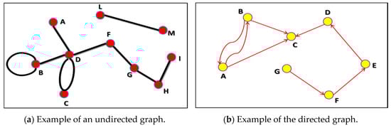 A graph is a set of nodes and edges. The nodes are referred to as vertices/vertex, and the edges are lines or arcs that connect any two/multiple nodes in a graph. A graph can be mathematically represented with G. For example, in SNs a user’s graph is G(U, V) where U is the list of users, and V represents the set of edges showing the relationship between the users or items. The graphs are of two types: directed and undirected. In undirected graphs, the edges have no direction. An example of the undirected graph is shown in Figure 2a. For example, in Figure 2a depicted below, there is a relationship between L and M, and this is the same thing as saying there is a relationship between M and L. We can refer to the line between M and L as (LM) or (ML) as it makes no difference in interpretation/understanding. The potential examples of the undirected graph are people and friendship in a SN or scientist and co-authored papers in a collaboration network. In contrast, in the directed graphs, the edges do have a particular direction (i.e., they can be regarded as incoming or outgoing). In these cases, the graphs are drawn with edges having arrowheads. The directed graphs are commonly known as digraphs. An example of directed graph is presented in Figure 2b. This might record the social relation “who likes whom” in a SN. Persons A, B, and D all say they like person C. Note that person C does not say that he likes A, B, or D. B and A like each other. Nobody says they like G. The example of directed graph is shown in Figure 2b. The potential applications of the directed graph are web pages and hyperlinks connections, Twitter follower graphs, interactions between users in a SN, and influence of one use on another user in SNs.