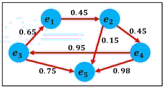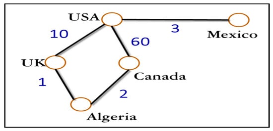 Furthermore, graphs can be classified into two additional categories: valued and non-valued. A valued graph has values (i.e., in the form of numbers) attached to the lines that represent the intensity or strength or quantity of the tie or frequency between the two nodes. The latter just represent the connection/relationship between nodes without any number. In SNs, the lines can represent the relationship (e.g., relative, friend, lover) between two users or the number of times a user X interacted with user Y. An example of a valued graph is shown in Figure 3, where the edge weight represents the amount of trade, in trillions of dollars, between five different countries. The possible example of a non-valued graph can be the close border of some countries with each other without specifying the length of the borders.