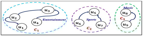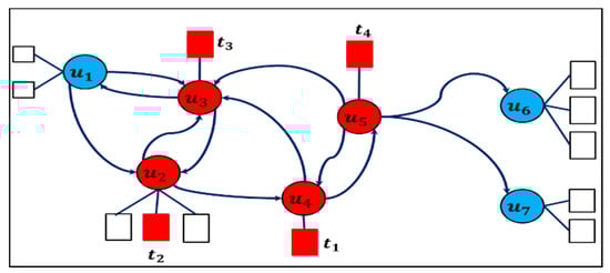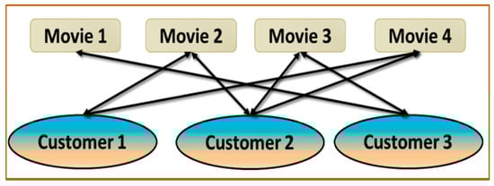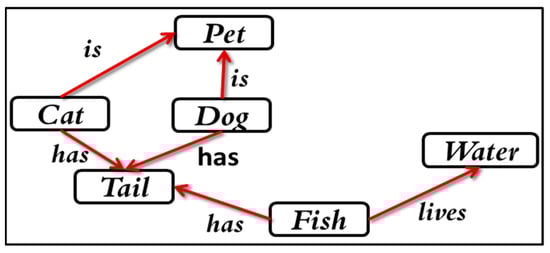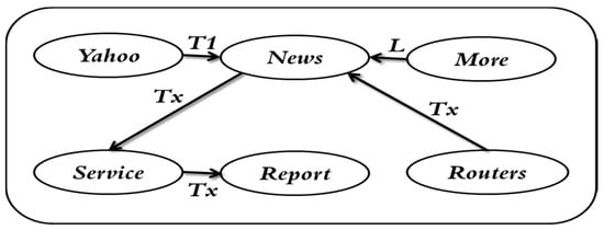 - Intent graph: This type of graph deals with reasoning and motivation. For example, on Twitter, a user’s tweets can be analyzed, and intents are mined from the Twitter posts []. Later, the intent can be classified into six categories, namely food and drink, travel, career and education, goods and services, event and activities, and trifle.