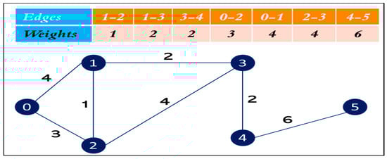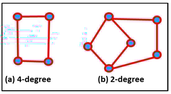 We can use GT concepts in network security to represent the network attacks in real time/offline. For example, a graph G with n number of vertices in which we search for a vertex of at most size k. Here, our aim is to find a minimum vertex cover in the graph whose vertices can be used as routing servers and whose edges will be used to connect these routing servers with each other [,]. Then, a worm circulation solution should be found, and we can try to define a defense strategy for networks against worm circulation only on the relevant vertex. A graph G which has a set of edges E is said to cover G if each vertex of G occurs on at least one edge in e. An example of the G and vertex that can cover the graph fully is given in Figure 8.