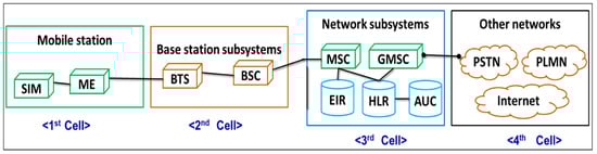 Group special mobile (GSM) is a geographical area network used for mobile phones. Geographical area is divided into hexagonal areas or cell of varying sizes. A communication tower is connected to a specific cell. Mobile phones are connected within a specific cell using that communication tower and all mobile phones are connected to the GSM network by finding cells in a nearby area. GSM networks have four different frequency ranges. Hence, a graph with four colors can be used to color the cellular areas. A vertex coloring algorithm can be used to allocate four different frequencies for any GSM network. This not only makes the network easier, but it improves the frequency adjustment as per the user’s requirements. An example of the GSM architecture is given in Figure 7. GSM and their related components can be modeled with graphs.