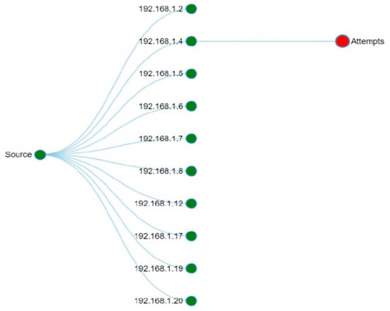 In addition, we can use graphs to perform real-time threat analysis. This can enable security analysts to deploy defense mechanism accordingly []. We can also present the failure attempts on a particular system via graphs. An example of this is shown in Figure 9.