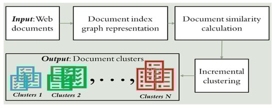 Web documents can be presented as a cluster in search engines. Web documents clustering is a process of organizing similar types of web documents together in a same class [,] or server. To optimize the query and appropriate information retrieval, it is desirable to keep similar types of web documents in one cluster []. Clustering is widely used in information retrieval processes [,,] and web document collections []. The concept of web document clustering is shown in Figure 13.