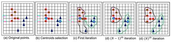k-means clustering algorithm is an exclusive clustering algorithm in which each data item is related to only one cluster. In the k-mean clustering algorithm, each cluster is represented by the center of the cluster called the mean point. k-mean algorithm can be implemented in four steps: (1) make the partition of the different documents into k non-empty subsets, (2) compute the mean point of each cluster, also known as seed point or centroid, (3) associate each document with its nearest cluster seed point, and (4) go back to step 2; stop when there are no more documents remaining separate from a cluster. An example of k-mean clustering working is given in Figure 14.