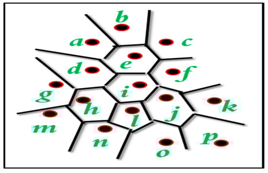 There are many applications of a wireless sensor network (WSN) such as defense applications and tracking of different mobile objects. A special type of graph is called the Voronoi graph, which decomposes a metric space determined by distance to identify the distinct set of objects within the space. A Voronoi graph is drawn in a plane with the help of polygons in which different nodes are presented as sensors and the boundaries of the polygon are considered as the range of every sensor. A pictorial overview of WSN as a Voronoi graph is shown in Figure 17. In Figure 17, alphabets a-p represent the sensor’s deployment location, and regions that are modelled with cells represent the coverage range of the sensors. With the help of graphs, sensor deployment and their coverage in an area of interest (AOI) can be modelled effectively.