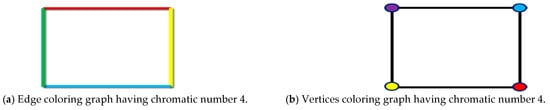 In many real-time applications of computer science, graph coloring technique is very important. There are many coloring methods available depending upon the requirement of the real-time applications. In graphs, proper coloring is used for the vertices and edges where no two vertices/ edges should have the same color. This type of graph is called a colored graph, and the minimum number of colors used in a graph is known as the chromatic number. The coloring is done in a way that two adjacent vertices/edges get distinct colors for the clarity. The example of edges and vertex coloring is shown in Figure 19a,b, respectively.