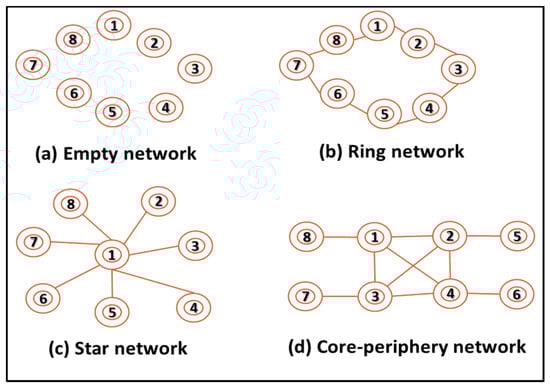 Figure 17 contains the regions for the sensor deployment. The related measures can be collected from each region and are processed at a base station. WSNs are useful for modelling and optimizing the transmission schemes []. A pictorial overview of a WSN as a graph is shown in Figure 18a. The nodes are the sensors and edges are the links between nodes. Each sensor is used for monitoring and recording the physical measures of the dedicated environment and retaining the collected data from a specific location S shown with a square in Figure 18a. There is one source which collects data from all sensor nodes. Some nodes from the network behave as relays for data forwarding to the sink. In addition, GT can be used to model the load balancing to maximize the WSN lifetime and real-time data collection from nodes []. The WSN topology and information flow is given in Figure 18b.