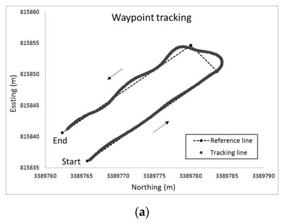Figure 11a shows the actual trajectories of the UAV (black dots) and the autonomous mobile GCP (yellow dots) that were synchronized with the collaboration strategy mentioned previously. The mobile GCP operated autonomously, without any interruption, and traversed to predefined waypoints with a maximum lateral deviation <15 cm (RMSE = 5.8 cm). Figure 11b shows the results of heading angles and operation mode commands obtained from the mobile GCP along the farm road. There was no change in heading angle when the mobile GCP was stopped at each waypoint, and heading fluctuated from 297.3° to 317.3° when in motion. Overall the mobile GCP performed as expected, stopping or moving forward along the six waypoints when the operation commands changed from on (“1”) to off (“0”) or from off to on, respectively. The proposed path tracking algorithm and collaboration strategy worked effectively to establish communication between the UAV and the mobile GCP.