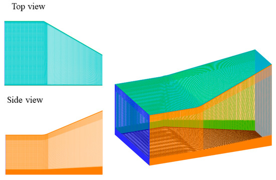 Figure 2 and Figure 3 show the meshes used in the current simulation. A structured multiblock mesh is used in this study. The meshing tool used is ANSYS ICEM. Denser mesh is assigned at the near-wall region, and the y+ of the first grid is ensured to be smaller than 1. The total length of the test section is 3.658 m. In order to save computational time, the whole test section is first simulated using a realizable model with a 5 million mesh. A uniform velocity profile is applied to develop a turbulent boundary layer from the very beginning of the test section. Then the time-averaged velocity profiles are extracted at a section 2.675 m downstream. The remaining test section is simulated using the LES model through a 4 million mesh (shown in Figure 3), where the extracted velocity profiles are implemented as inlet boundary conditions. Random vortex perturbations are superimposed on the time-averaged velocity profile to consider the turbulence fluctuations. The time step used for the simulation is 1.0 × 10−6 s. The time step meets the CFL condition to make sure that the fluid from a given mesh cell propagates only to its immediate neighbors within one time step. The CFL has the form . The time step needs to be carefully chosen such that is valid everywhere in the computational domain. For example, a given mesh cell has and cell length , the time step results in , which satisfies the CFL condition.