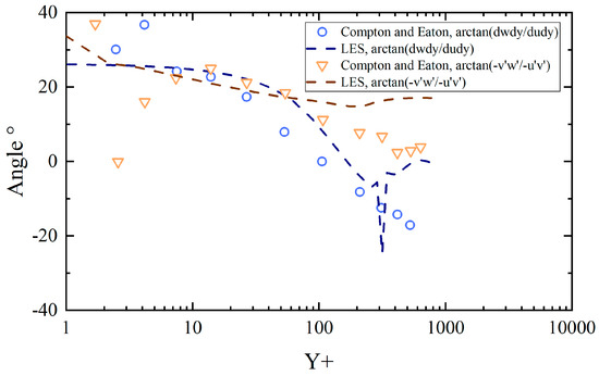 Comparison of angles of stress and strain at x = 0.4445 m, z = 0.0 obtained from LES model results and experimental data [14].