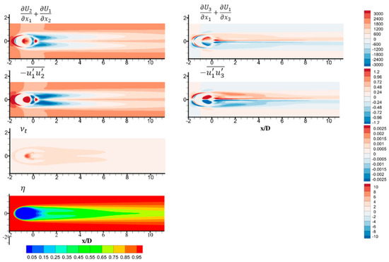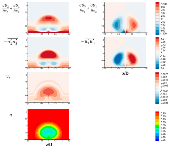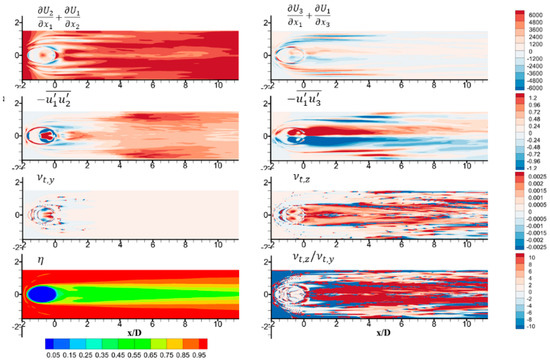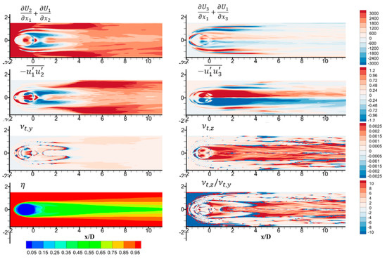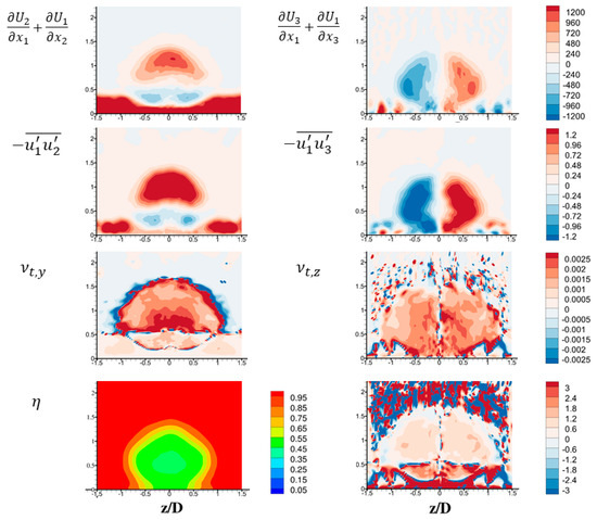 For realistic data post-processing, the terms , , and are obtained from instantaneous data sampling. This means averaging instantaneous results over a period of time, through the custom field function in ANSYS Fluent. Specifically, for the averaged data, the eddy viscosity of interest in vertical and spanwise direction can be found from Equation (17):