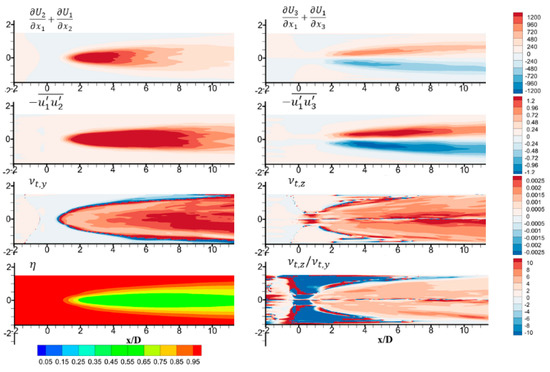 Figure 8 and Figure 9 show the front view of the strain rate, the Reynolds stress, the eddy viscosity and the dimensionless temperature distributions obtained by LES and RANS at x/D = 5 plane. Both the URANS and LES models show negative values on the left and positive values on the right side of the jet for and terms. Due to the counter rotating vortex pair, both and are negative on the left and positive on the right in the given coordinate system. In many regions, the absolute value of is smaller than that of within the film cooling jet, which makes the term generally follow the sign of . is positive on both sides of the jet, so tends to follow the sign of .