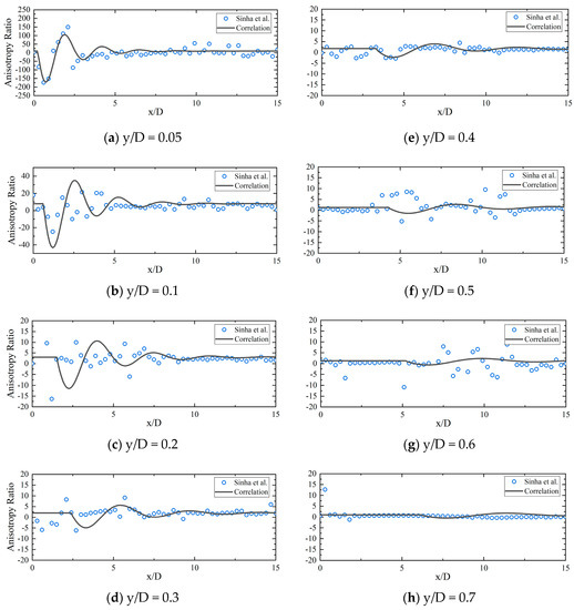 After the fitting of the damping ratio and the transformation parameters of , , , , a correlation of the streamwise direction distribution of the anisotropy ratio has been obtained as follows: