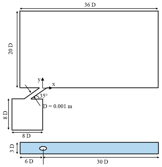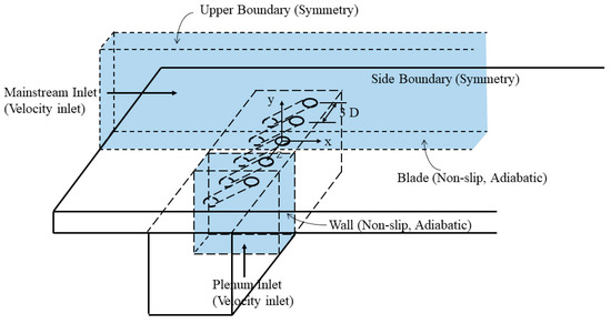 The computational domain was proposed accordingly. Schematics of the front and top views of the computational domain are shown in Figure 17. The computational domain for the mainstream was 36D × 20D × 3D, with a length of 6D before the hole and 30D downstream. With a mainstream velocity of 30 m/s and room-temperature conditions, three blowing ratios of 0.5, 1.0, and 1.5 under density ratio of 0.967 were simulated, corresponding to the previously introduced experiment. The freestream turbulence intensity for the cases was assumed to be 1.5%.