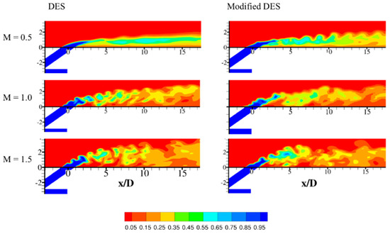 Side view of instantaneous dimensionless temperature contours for M = 0.5, 1.0, and 1.5 in the center plane obtained using DES and modified DES models.
