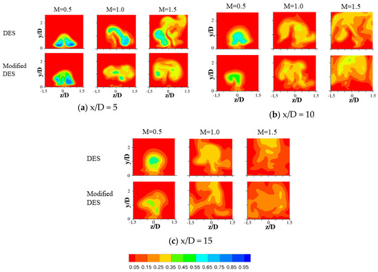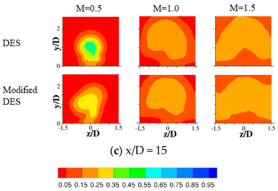 Front view of time-averaged dimensionless temperature contours at (a) x/D = 5, (b) x/D = 10, (c) x/D = 15 obtained using the DES and modified DES models.