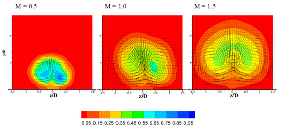 Figure 21 depicts the front view of time-averaged dimensionless temperature contours and velocity vectors at x/D = 5 for detailed flow structure analysis. The distance between the core of the jet and the surface increases; the averaged surface contact region decreases with increasing blowing ratio. The spanwise mixing is enhanced at higher blowing ratios. Counter-rotating vortex pairs are observed in the vector plots. The entrainment of hot gas from the mainstream to the surface is found to reduce the protective effect of the cooling jet.