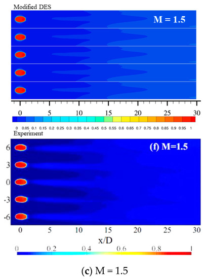 Figure 24 gives a quantitative comparison of centerline effectiveness calculated using the URANS, DES, and modified DES models with the experimental results. For M = 0.5 and M = 1.5, modified DES shows a higher centerline effectiveness compared to the DES model results, which is closer to the experimental data. The original DES model overpredicts the jets’ liftoff. The modified DES model shows better results. After x/D = 10, the modified DES model shows a lower prediction of the centerline effectiveness. As the jet reattaches to the blade surface, turbulent diffusion is more effective. URANS generally overpredicts the centerline effectiveness after the hole because it does not resolve any vortices and unsteadiness, so spanwise spreading is underestimated. A quantitative comparison of the original DES model and modified DES model has been made. Under a blowing ratio of 0.5, the DES and modified DES deviate by 62.4% and 51.5%, respectively, from the experimental data. Under a blowing ratio of 1.0, the DES and modified DES deviate by 39.8% and 26.7%, respectively, from the experimental data. Under a blowing ratio of 1.5, the DES and modified DES result in 33.5% and 28.9% deviations, respectively, from the experimental results.