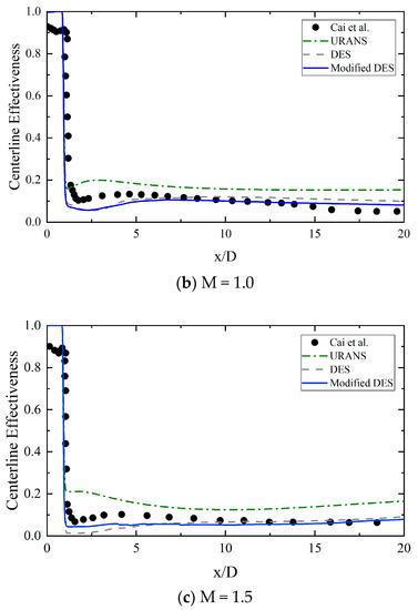 Comparison of centerline effectiveness from the URANS, DES, and modified DES models with the experimental results [33] for (a) M = 0.5, (b) M = 1.0, and (c) M = 1.5.