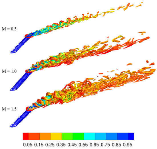 Figure 25 shows the vortical structures in jet and crossflow interaction colored by dimensionless temperature from modified DES simulations. Detailed vortical structures like horseshoe, Kelvin-Helmholtz, and hairpin vortices are clearly seen in the results. It is found that the initial oscillations create the horseshoe vortices. In the near field, the rolling-up of the shear layer is predicted in the modified DES simulation, which enhances convection and advection in fluid transport. The strong shear between the jet and mainstream generates the Kelvin‒Helmholtz vortices. As the blowing ratio increases, the momentum ratio increases from 0.259 to 2.327, and more vortices are generated in higher blowing ratio cases. Another indication from Figure 25 is that more mixing is induced in the M = 1.0 and 1.5 cases, as the color is more uniform in these cases.