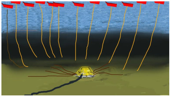 The dimensions of the generator depend on the location and ocean topography (average wave height, average power, and time period of waves). The number of generators required depends on the frequency and energy of the waves in the selected area. Each generator is pivoted towards the sea bottom, as shown in Figure 6. A power control unit is connected in tandem to each generator to process power before it is fed into the local grid. As shown in Figure 6, a central hub takes the feed from each generator and the power control unit and supplies it to a shoreline-based substation via transmission cables [9,10].