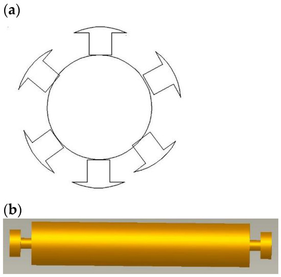 As shown in Figure 7a, the rotor design is similar to a conventional DC generator rotor. The rotor has two circular ends to facilitate motion in machine grooves and an iron shaft to house the rotor winding. Figure 7b also shows a schematic representation of winded poles housed on an iron shaft. The rotor design requires parameters such as the rotor diameter, number of poles on the rotor, rotor length, and number of windings on each pole. Equation (1) gives the rotor velocity, which does not depend on the mass and diameter of the rotor.