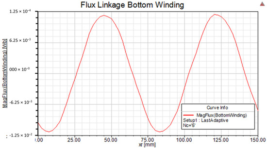 Figure 15 shows the sinusoidal flux linkage in the bottom coil of the stator winding due to the excited rotor motion. The bottom coil turns five times and generates a maximum flux linkage value of around 13 mWb.