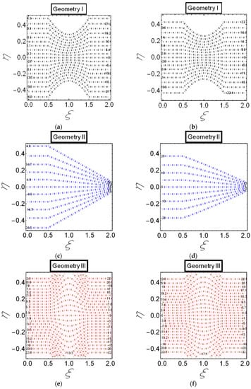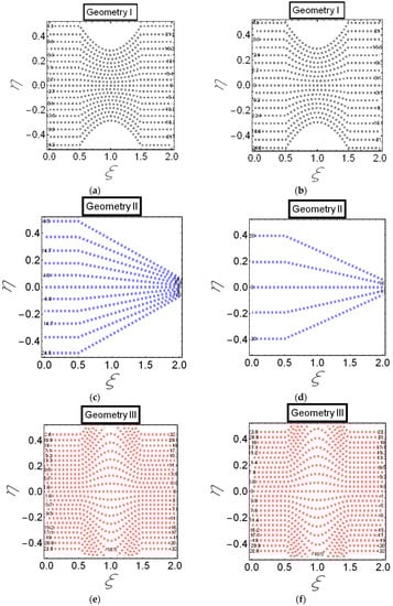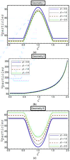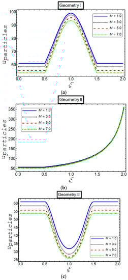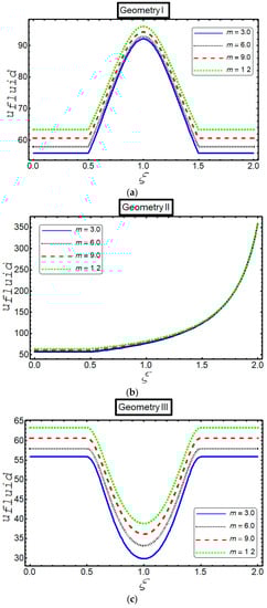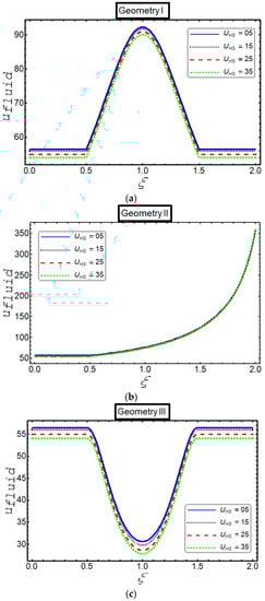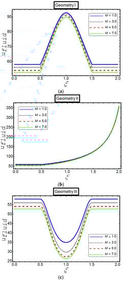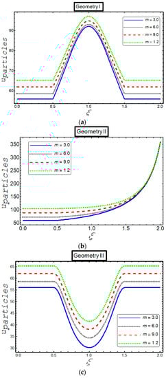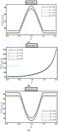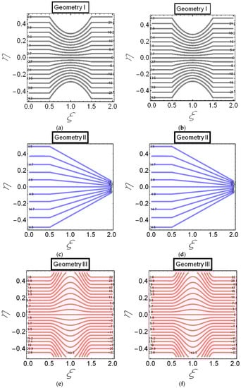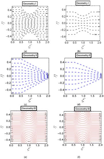 - In the case of Hartmann number , Helmholtz–Smoluchowski , and slip parameter , the graphs of streamlines are the same for all three geometries. However, the reduction of the streamlines for electro-osmotic parameter , is observed. This behavior is due to the curve-like structure of the channel.