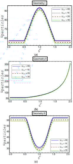 - The velocity of particle phase decreases against the slip parameter, in geometry I and geometry II whereas it increases in geometry III.