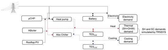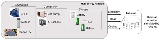 Scheme of the pre-defined superstructure of the multi-energy nanogrid (MEN) with the energy technologies proposed to be part of the optimal configuration.