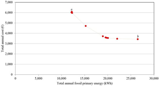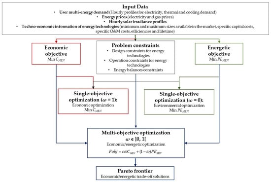 where c is a constant scaling factor chosen to have two objectives of the same order of magnitude, and ω is the weight varying in the interval 0–1. In detail, with ω = 1, it is possible to find the solution that minimizes the total annual cost, whereas with ω = 0, it is possible to find the solution that minimizes the total annual fossil primary energy input to the MEN. Instead, the Pareto frontier can be found by varying the weight ω in the interval ]0, 1[. A detailed flowchart of the multi-objective optimization problem formulated above is shown in Figure 3.