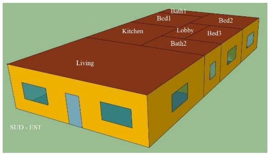 The hourly energy demands for space heating and cooling were evaluated through the dynamic simulation software TRNSYS 17. The considered building was divided into eight rooms (living, kitchen, two baths, three bedrooms, and a lobby), and each room was modeled as a different thermal zone, as shown in Figure 4.