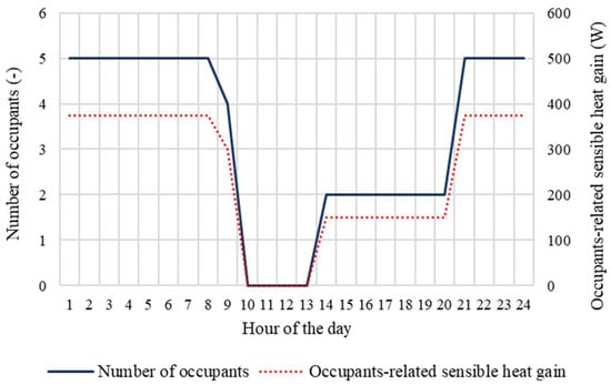The Type56 of TRNSYS was used to model the thermal behavior of the building, and the TRNSYS 3D plug-in for Google SketchUp to draw the multi-zone building and import the geometry from the SketchUp interface into the TRNSYS building environment (TRNBuild). By importing the building in TRNSYS Simulation Studio Interface, the weather data and the ground temperature, evaluated according to the Hadvig relation, relative to the city of Turin, were assigned. The construction of the opaque components of the building was defined so that the wall transmittance of the external walls, the roof, and the ground floor were set equal to 0.34, 0.30, and 0.33 W/m2/K, respectively. For the windows, the glazing and frame transmittance were set equal to 6.56 and 1.53 W/m2/K, respectively [25], and the area of each window was defined as the 12.5% of the useful area of the zone where the window is located [26]. For each thermal zone, the air exchange rate was assumed to be equal to 0.28 h−1 [27]. According to the Italian Law [25], for the climatic zone E, the duration of the heating season goes from 15 October to 15 April. As a consequence, for each thermal zone, the indoor air temperature was controlled during this time interval by setting the set-point temperature for daytime (6.30 a.m. to 11 p.m.) and night-time heating at 21 °C and 15 °C, respectively. Moreover, for each thermal zone, a set-point temperature equal to 26 °C was set to control the indoor temperature during the cooling season, from June to August. Heat coming from occupants, household appliances, and lighting systems were assumed to contribute to the internal gains of the building. In detail, the number of the occupants was fixed at 5 and the sensible heat coming from each one was assumed to be equal to 75.0 W, considering light work/typing as the degree of activity, according to the Standard ISO 7730 [26]. The number of occupants and occupants-related sensible heat gain as a function of the time are shown in Figure 5.