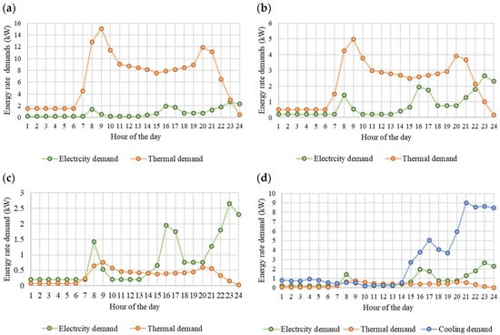 Hourly mean energy rate demand of the end-user: (a) a representative cold season day; (b) a representative cold mid-season day; (c) a representative hot mid-season day; and (d) a representative hot season day.