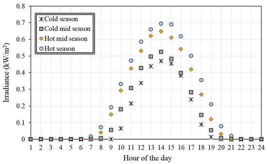 Solar irradiance profiles were built up based on meteorological data in Turin [32]. In detail, the hourly solar irradiance on a 35° tilted surface for each representative season day was evaluated as the average of the hourly mean values of the solar irradiance in the corresponding hour of all days in the relative season. The average hourly solar irradiance profiles for the four representative season days are shown in Figure 7. The maximum available area for installation of the rooftop PV arrays was assumed to be 190 m2.