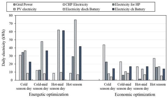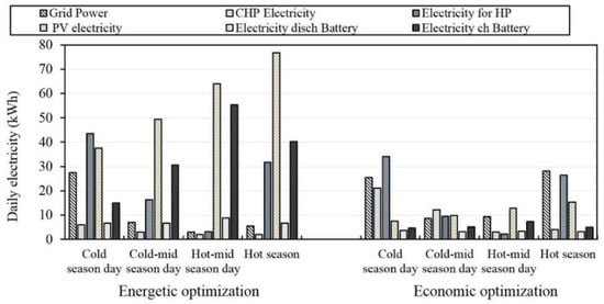 The total annualized investment cost of all technologies is represented in Equation (1), and it was calculated as the product of the capital recovery factor of the technology i (a parameter), the specific capital cost of the technology (a parameter), and its designed size (a continuous decision variable). The capital recovery factor depends on the lifetime of the technology and the interest rate, according to the formula in (1). The total annual O&M cost of all technologies is represented in Equation (2), and it was calculated through multiplying the specific O&M cost of the technology i (a parameter) by the generation level of the technology at hour hr of day d (a continuous decision variable), and the length of the time interval (1 h). Note that for the battery and thermal storages, the O&M costs were calculated through their capacities. The total cost associated with natural gas is defined in Equation (3), and it was calculated through multiplying the gas price (a parameter) by the total amount of gas consumed by the µCHP and the auxiliary boiler (dependent decision variables), which depended on their generation levels at hour hr of day d (continuous decision variables) and their conversion efficiencies (parameters). The total cost of buying grid power, formulated in Equation (4), was calculated as the product of the time-varying unit price of electricity from the grid (a parameter) and the total amount of electricity taken from the grid (a continuous decision variable).