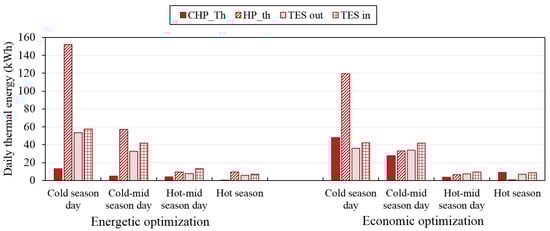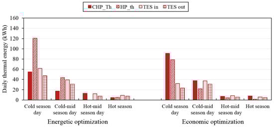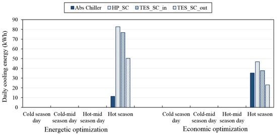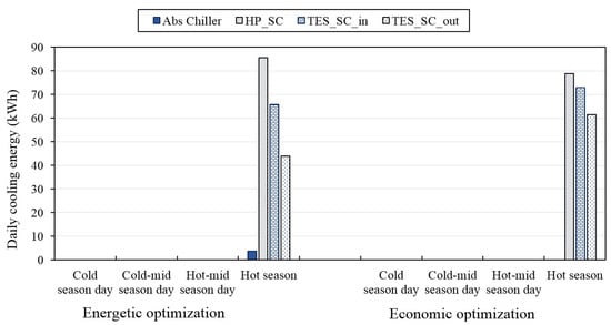 The outputs of the TRNSYS simulation were the hourly profiles for space heating and space cooling of the building for the entire heating and cooling season, respectively. Starting from these, the hourly energy rate demand for space heating and space cooling was built up for four representative season days. In detail, the year was assumed to be composed of 90 days in the cold season, from December to February; 92 days in the cold mid-season, from 15 October to 30 November and from 1 March to 15 April; 91 days in the hot mid-season, from 15 April to 31 May and from 1 September to 15 October; 92 days in the hot season, from June to August. Therefore, the hourly energy rate demands for space heating and space cooling for each representative season day were evaluated as the average of the hourly mean values of the space heating and space cooling, respectively, in the corresponding hour of all days in the relative season.