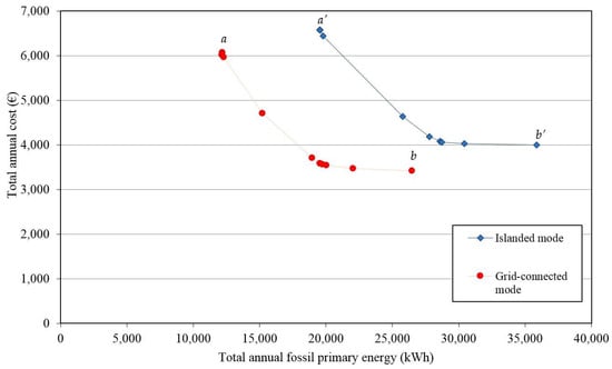 In the numerical testing, a single-family house of 200 m2 located in the Italian climatic zone E, in the city of Turin, is considered as the residential end-user. To identify the hourly space heating and cooling profiles of the user, the thermal behavior of the building is simulated using the dynamic simulation software TRNSYS, whereas the electricity hourly profiles are built up considering the number of occupants, the use of appliances, and the lighting systems, and the domestic hot water hourly profiles are estimated based on the number of occupants. Two scenarios are investigated, where the MEN operates in grid-connected and islanded modes in terms of electricity supply. In both the analyzed scenarios, results show that the Pareto frontiers provide good balancing solutions for the end-user based on economic and energetic priorities. Moreover, the MEN operating in grid-connected mode shows economic and environmental performances much better than those found for the MEN operating in islanded mode.