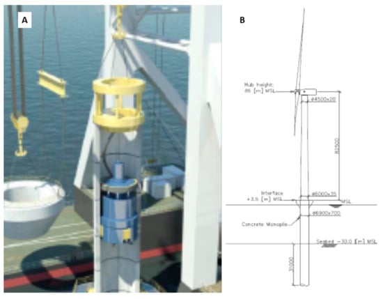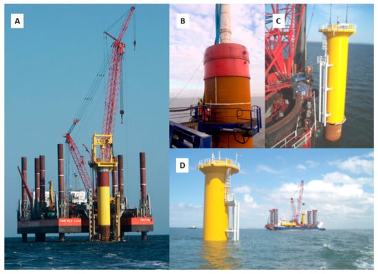 In addition to their apparently conceptual simplicity, monopile foundations, seen in Figure 1A, are far from the usual standards of onshore engineering. This is mainly due to their size and usage of a transition piece between the pile and wind turbine tower [22,23].