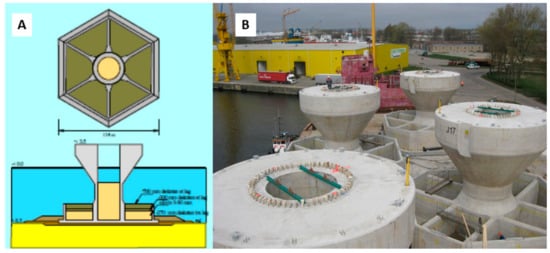 (A) Gravity base structure (GBS) at Nysted (Denmark). (B) GBS ready for transportation “Rodsand 2” (Denmark).