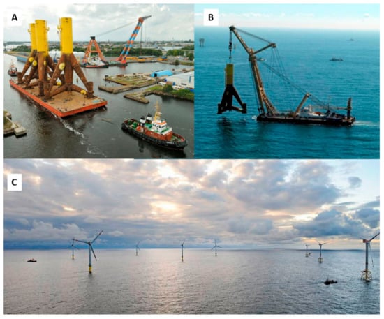 Alpha Ventus windfarm. (A) Tripod foundation transportation. (B) Tripod foundation installation. (C) Jackets (right side) and tripod (left side) foundations installed.