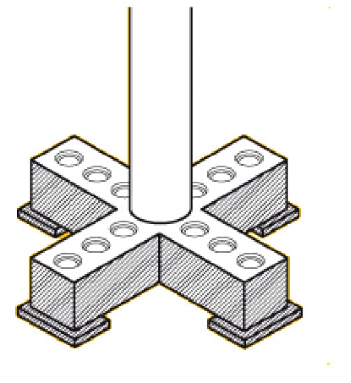 It is a gravity base foundation made up of a cross-shaped box based on four legs and made of pre-tensed steel, which lies down over the ground [70]. In this case, the ground only requires minimum preparation for the installation of this structure. A scheme of this structure can be seen in Figure 9. The main characteristics of this foundation are as follows [71]: