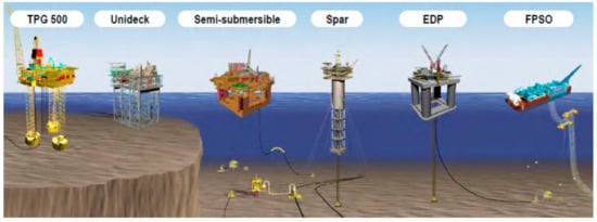 Floating structures are neither a technically nor economically viable solution yet. Nevertheless, research on these solutions is very active today in a few remarkable projects, even more when “near-shore” projects are no longer available and it comes to exploring deeper waters (>50 m depths). As per the fixed structures case, these new developments are inspired by the evolution of floating structures coming from the oil and gas experience [72,73,74]. Figure 10 shows a representation of the floating structures used in the oil and gas industry.