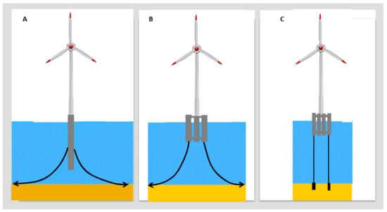 Floating wind foundations typologies [76]. (A) Spar-buoy structure. (B) Semisubmersible. (C) Tension leg platform (TLP).